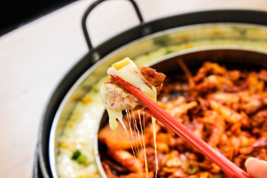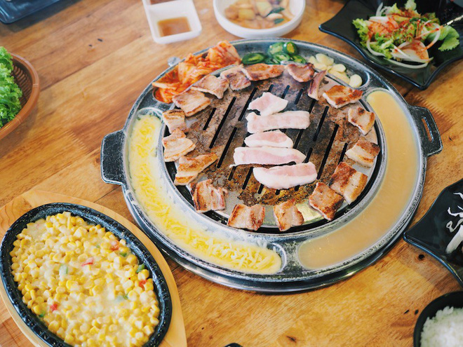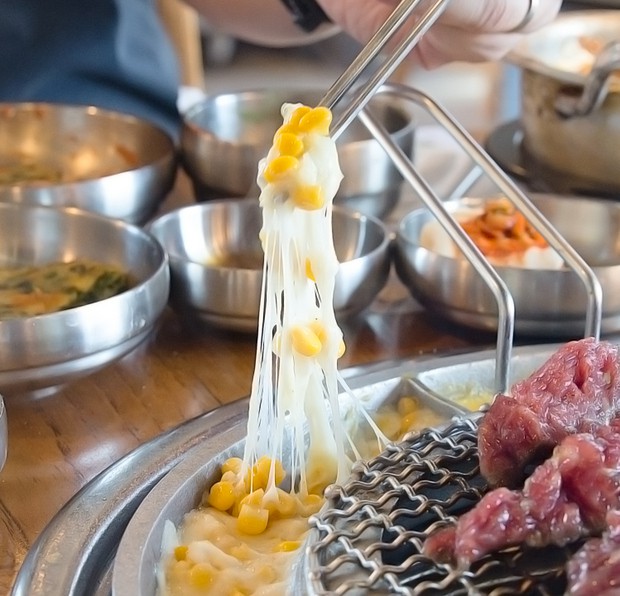 Món thịt nướng BBQ Hàn Quốc đã hấp dẫn khó chối từ, thêm phô mai là một điểm cộng lớn. Quấn một miếng thịt mềm ngọt nóng hổi với phô mai dai dai, mịn màng, hương vị của thịt sẽ được nhân lên gấp bội. Bạn có thể thử ba chỉ bò nướng, sườn tẩm ướp, cổ lợn, gà ướp và bạch tuộc cay ăn cùng phô mai. Nếu uống được rượu, bạn có thể gọi thêm soju để ăn hoài mà không ngấy.