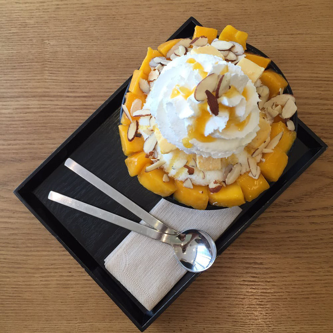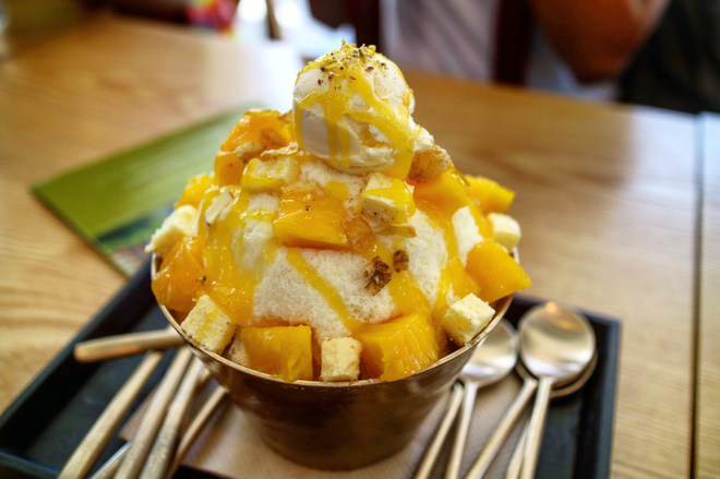 Ngay cả Bingsu là món tráng miệng mà cũng có phiên bản phô mai lạ miệng. Món Bingsu phô mai có thể được kết hợp với nhiều loại topping, nhưng phổ biến nhất là xoài. Phô mai được sử dụng cho món này thường có vị nhạt, thơm béo, kết hợp với vị chua chua ngọt ngọt của xoài và kem mát lịm tạo thành món ăn giải nhiệt không thể tuyệt vời hơn.
