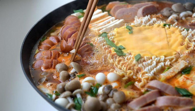 Budae Jjigae hay canh quân đội là món ăn kết hợp giữa ẩm thực Hàn Quốc và ảnh hưởng từ các nền ẩm thực quốc tế. Món canh thập cẩm được nấu từ nhiều nguyên liệu khác nhau, từ đậu phụ, xúc xích, tới mầm cải… nhưng không thể thiếu phô mai vàng của Mỹ và đậu đóng hộp. Món canh này có hương vị đậm đà, thơm ngậy, để lại ấn tượng khó quên cho thực khách.