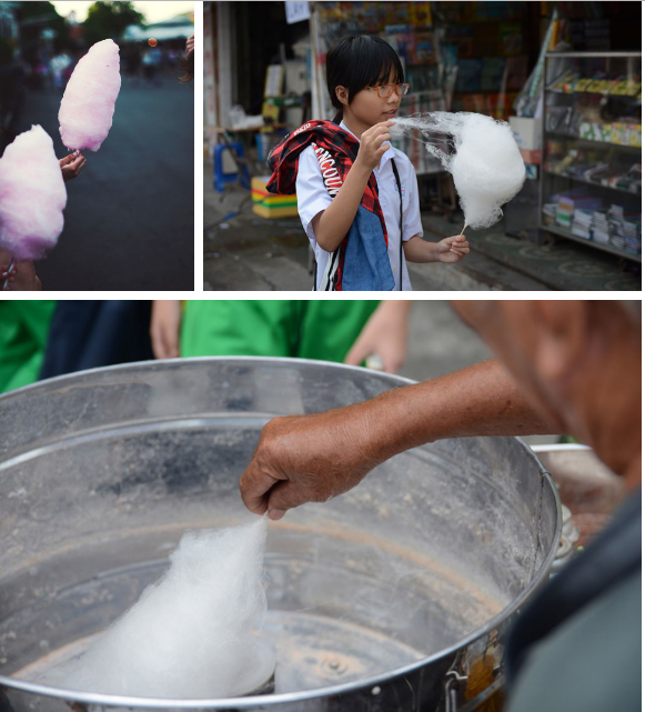 Hình ảnh quen thuộc nhất đối với những đứa trẻ hồi đó chính là que kẹo bông đáng yêu và ngọt ngào. Đơn giản chỉ cần chút đường cho vào máy quay và trong tích tắc sẽ có ngay một chiếc kẹo bông mịn màng. Vị ngọt lịm tan chảy này đã từng là món quà vặt quý giá của trẻ con ngày trước.