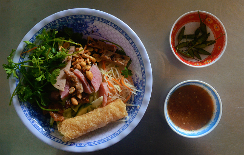 Hễ nhắc đến Bình Định thì không thể không kể đến nem và chả cá, món bún này là biến tấu từ cả hai đặc sản trứ danh của đất võ. Món ăn gồm bún tươi, nem chua, chả cá nướng và rau sống, thêm chút đậu phộng, cải chua và rau ngò tạo mùi thơm.