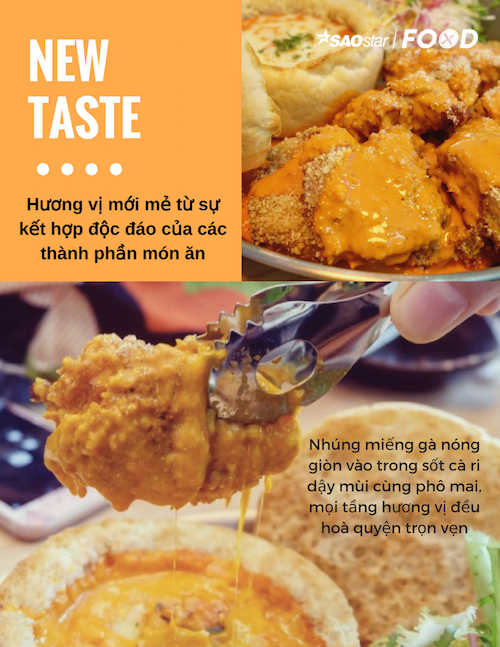 Những miếng gà mềm mại bao bọc bên trong lớp gạo lức giòn rụm, bạn chỉ cần quệt nhẹ lên nước sốt, sau đó nhúng ngập vào trong phần phô mai béo và kéo. Một lần cắn như cả thiên đường ngập trong miệng, thịt gà mềm mại tươi ngon tiếp thêm chút giòn của lớp bột gạo lứt, hoà vào đó là cái béo và hương thơm đặc trưng của sốt cà ri phô mai. Thật sự món gà sốt mới mẻ này đã làm tươi mát khẩu vị của thực khách sau khoảng thời gian bị gà cay chiếm lĩnh.