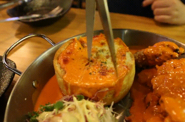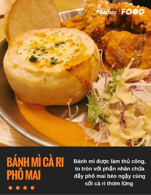 Điều khiến món gà này vương vấn hương vị là nhờ sốt cà ri béo thơm của Hàn Quốc. Nước sốt vàng tươi, sóng sáng được rưới đều lên những miếng gà nóng hổi làm dậy mùi hương. Không dừng ở đó, mỗi chảo gà sẽ luôn được kèm theo một chiếc bánh mì làm thủ công tròn to ụ. Mở phần nắp bánh ra, bạn sẽ điêu đứng trước lớp phô mai hoà quyện cùng cà ri tan chảy thơm phức đang chờ bạn thưởng thức. Cái giòn của gà nay được tiếp thêm cái béo cái sệt của phần nước sốt thì chẳng thể chê vào đâu.