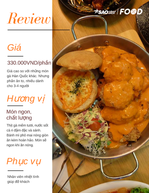 Một phần gà có giá cỡ 330.000 chưa bao gồm thuế 10%, giá cao so với những món gà phô mai Hàn ở các quán khác hiện nay. Tuy nhiên, phần ăn khá nhiều, sẽ hợp lí và vừa miệng nếu bạn ăn cùng 2-3 người bạn nữa. Như thế vừa có thể cùng nhau share chi phí vừa thưởng thức trọn vẹn hương vị của món ăn.