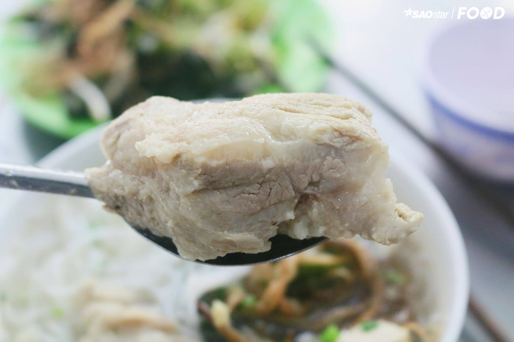 Sườn heo được ninh khá kỹ và mềm nhừ, chỉ cần xắn đũa nhẹ, thịt cũng có thể tự tách ra được. Tuy nhiên, sườn heo được dùng ở đây khá nhiều mỡ nên dễ gây ngấy, kén người ăn, đặc biệt là những thực khách ưu tiên phần thịt nạc nhưng không bị khô hơn.