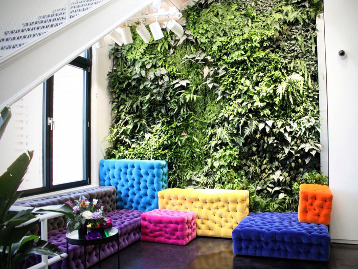 Không gian làm việc vô cùng đẹp mắt, chan hòa ánh sáng chính là niềm cảm hứng dành cho nhân viên của Instagram mỗi khi làm việc. Ở một góc văn phòng với một tường cây xanh trải dài được để những chiếc ghế đầy màu sắc dành cho nhân viên thư giãn.