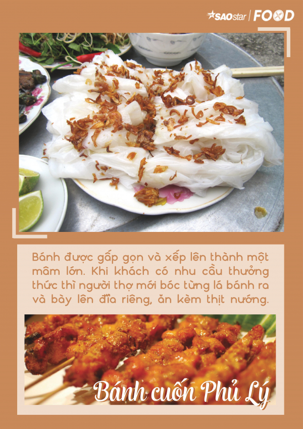 Chính vì vậy mà bánh cuốn Phủ Lý có phần cứng và dày hơn bánh cuốn ở những nơi khác. Ăn kèm với nước chấm và hành phi vàng ươm trên mặt bánh. Hơn nữa, bánh cuốn ở đây sẽ ăn kèm với thịt nướng, hay còn gọi là chả nướng, chứ không ăn kèm cũng các loại giò. Thịt nướng được nêm nếm vừa ăn, tỉ lệ nạc và mỡ vừa phải, thơm mùi than nướng, ăn vào sẽ nhớ mãi hương vị đặc trưng mộc mạc này.