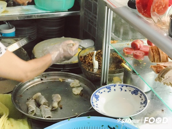 Khác lạ so với bánh cuốn thông thường với lớp vỏ ngoài chỉ là bột, bánh cuốn đặc biệt này ướm lên màu vàng của trứng được đánh đều tay trông vô cùng hấp dẫn. Chỉ khi có người gọi, cô chủ mới đổ bánh nên bạn sẽ được thưởng thức những chiếc bánh nóng hổi, thơm ngon.