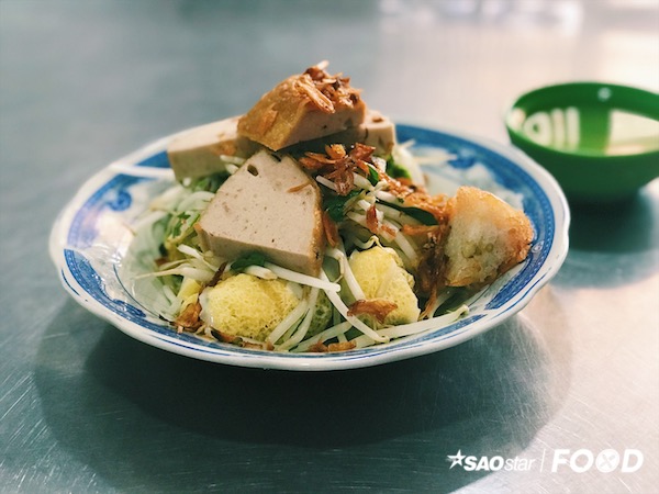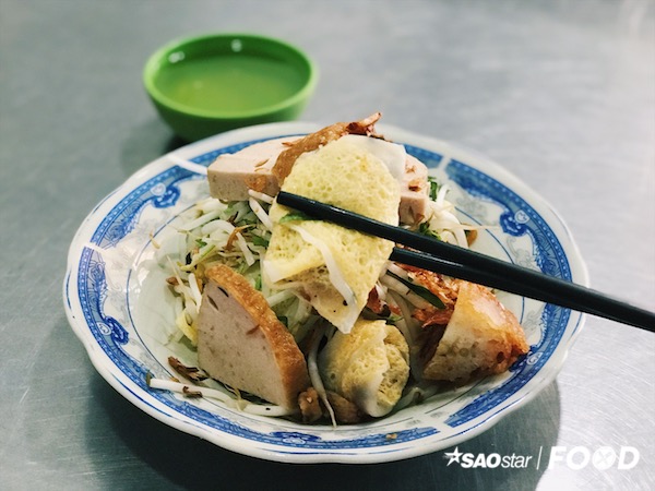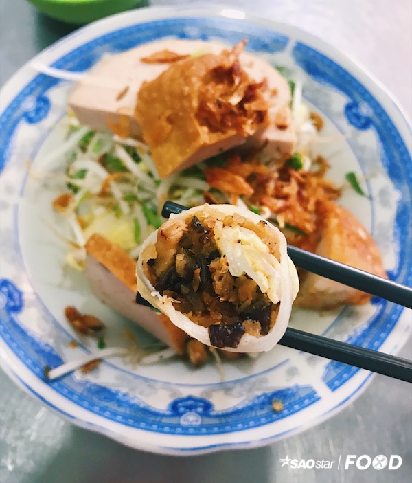 Dĩa bánh bày ra đầy đặn với những món ăn kèm quen thuộc như chả lụa, chả quế, nem, bánh tôm chiên. Bên dưới, những chiếc bánh đươc xếp đều đặn đang “ẩn mình” trong giá trụng và rau như đang chờ bạn khám phá.