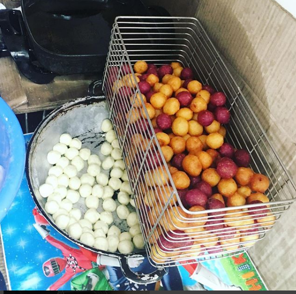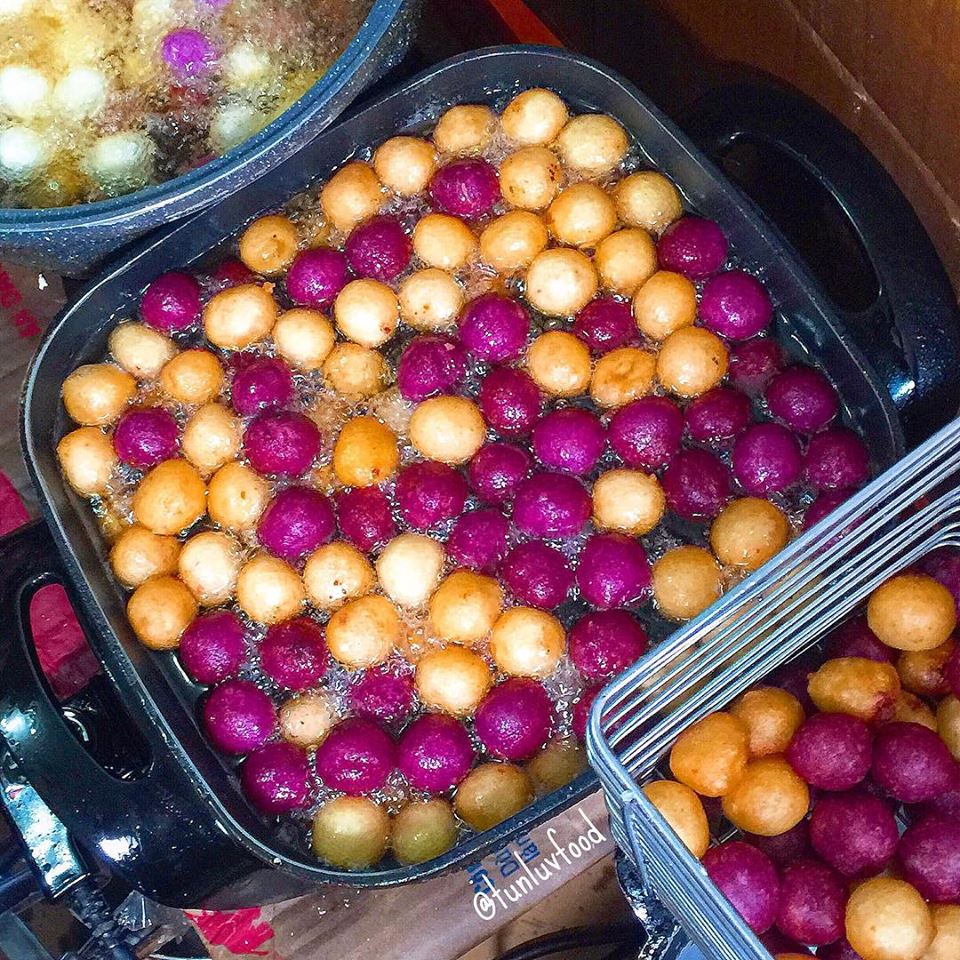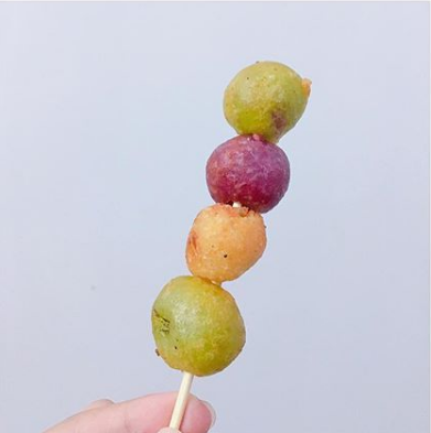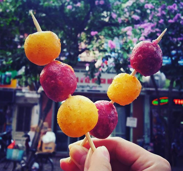 Bánh rán bi nhiều màu khi xiên vào nhìn giống với kẹo hồ lô. @suisit9394
