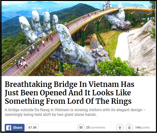 Cây cầu Vàng với đôi bàn tay nâng đỡ ở Đà Nẵng (Việt Nam) thật sự đã trở thành tâm điểm chú ý của Việt Nam lẫn thế giới. Đã có khá nhiều bài viết và lời khen ngợi dành cho cây cầu này đến từ báo chí nước ngoài, khiến người Việt Nam cảm thấy vô cùng tự hào.
