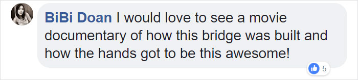”Tôi thật lòng muốn xem một bộ phim tài liệu nói về việc cây cầu này được xây ra sao, và làm thế nào mà đôi tay kia lại tuyệt vời đến vậy!”
