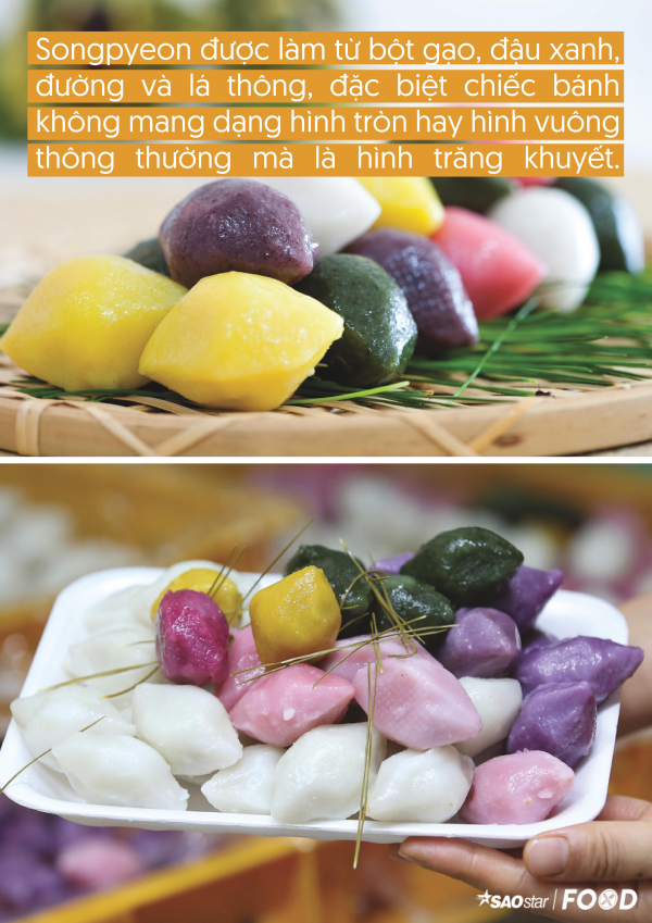 Bánh Trung thu của Hàn Quốc được gọi là Songpyeon được làm từ bột gạo, đậu xanh, đường và lá thông, đặc biệt chiếc bánh không mang dạng hình tròn hay hình vuông thông thường mà là hình trăng khuyết. Bánh Songpyeon không chỉ mang màu trắng mà còn được sáng tạo nhiều màu khác nhau như xanh đậm, vàng hay hồng, cực kì bắt mắt và chính vì được hấp cùng lá thông nên hương vị ngọt ngào dịu nhẹ, kết hợp hài hòa với nhân đậu dẻo mịn bên trong.