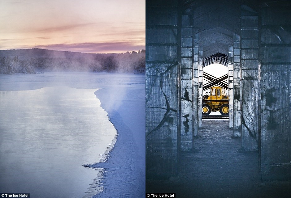 Nguồn nguyên liệu xây dựng khách sạn mỗi năm lấy từ sông Torne gần đó (trái). Các nghệ nhân dành hai tháng với các dụng cụ như cưa xích, cuốc đá và máy kéo (phải) để chuẩn bị, sau đó tạo ra những căn phòng ấn tượng.