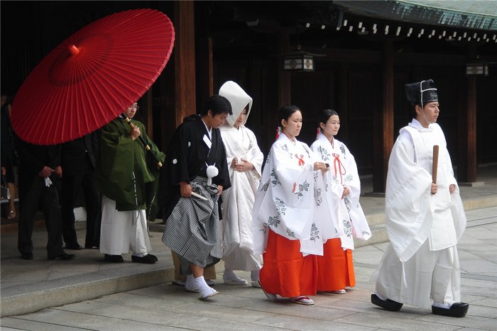Đền thờ Shinto (Thần đạo) ở Nhật Bản đều do nữ giới canh gác. Những cô gái này hầu hết đều còn trẻ, mặc hakama đỏ (quần ống rộng) hoặc váy đỏ, áo kimono trắng (hoặc áo khoác) và buộc tóc. Những cô gái này được gọi là miko - “trinh nữ tế thần” hoặc Vu nữ.