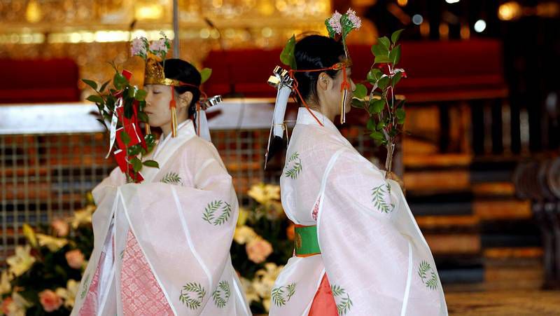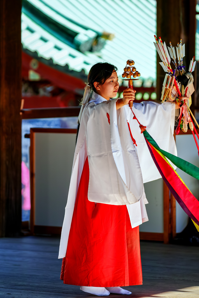 Những cô gái canh đền ở đây đều trẻ trung và vô cùng xinh đẹp. Các Vu nữ đảm nhận nhiệm vụ như thực hiện các nghi lễ, ra quẻ bói, lên đồng… Họ nhảy múa các điệu truyền thống gọi là miko-mai. Từ thời Minh Trị, Vu nữ trở thành những người làm việc trong đền thờ, trợ giúp các hoạt động cúng lễ ở đây.