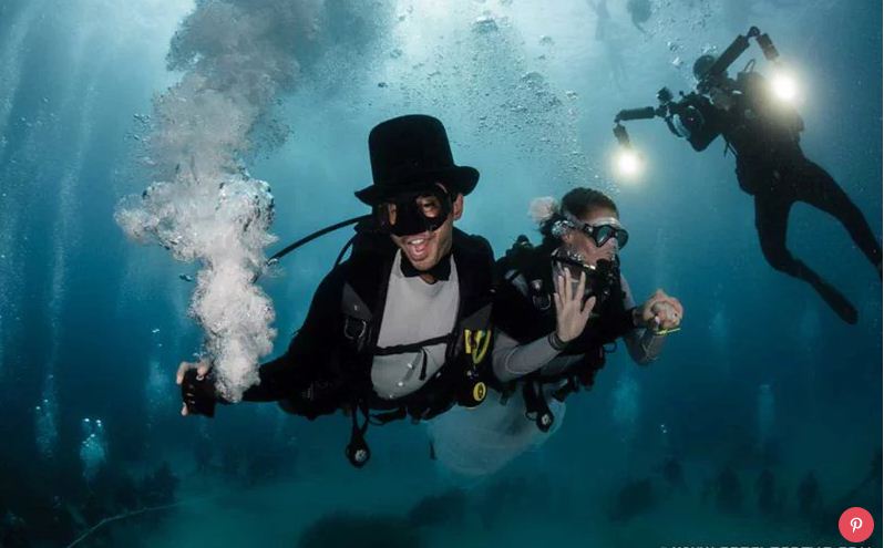 Khách mời cũng có thể dự đám cưới dưới đáy biển với trang phục và thiết bị lặn. Chú rể vẫn rất trang trọng trong trang phục đồ lặn tuxedo (với cả mũ và áo khoác) nhưng trang phục của cô dâu thậm chí còn đặc biệt hơn: một bộ đồ lặn bằng neoprene trắng với váy voan với một bông hồng trên mái tóc.