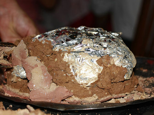 Gà đồi bọc đất nướng: Những con gà ri, gà tre nuôi thả rong trên núi nên thịt chắc, dai, ngọt, được chế biến thành gà hấp, gà quay, gà nướng mật ong, nhưng hấp dẫn nhất là món gà đồi bọc đất nướng. Gà làm sạch, bọc một lớp lá sen rồi đến lớp đất sét dày, nướng trên lửa than cho đến khi đất sét chuyển thành màu đen và bắt đầu nứt là gà chín. Xé gà khi còn nóng hổi và chấm muối tiêu chanh, buổi tối se lạnh ở phố núi Tam Đảo sẽ trở nên ấm áp hơn nhiều. Ảnh: kenhdulich