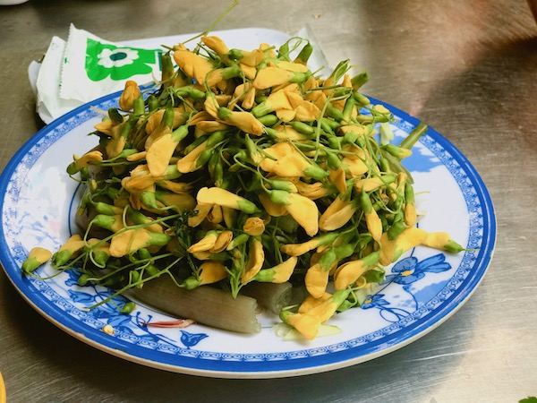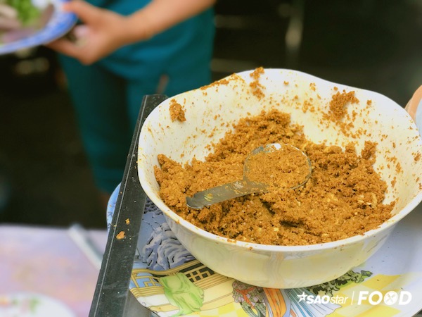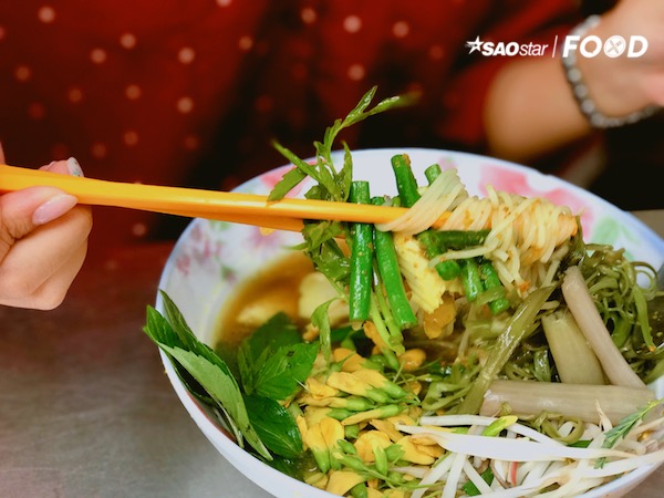 Cái hay là đĩa điên điển, loại rau chỉ có ở vùng miền Tây và hiếm khi được thưởng thức ở Sài Gòn cũng “góp sắc” cho phần món bún này thơm ngon hơn.