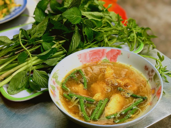 Tô bún thơm ngon ngoài màu trắng của cá, màu vàng của nước dùng thì còn điểm xuyết thêm màu xanh của đậu đũa. Và không thể bỏ qua một đĩa rau sống tươi ngon ăn kèm. Món ăn muốn đúng vị đầy đủ ngoài cái loại rau quen thuộc như bắp chuối, rau muống, dưa leo thái mỏng, bông súng thì phải thêm vị the the rau thơm.