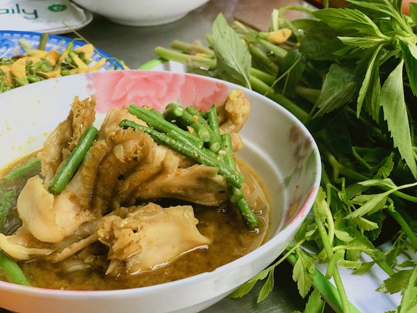 Nước dùng là sự pha trộn của nhiều tầng hương vị, mang đến nét đặc biệt của ẩm thực xứ chùa tháp. Trong sắc vàng ươm của nồi nước súp pha trộn nào là ngải bún, củ nghệ, sả,… tạo nên một gam màu bắt mắt và lôi cuốn vị giác. Tuy nhiên, cần phải kể đến sự có mặt của những thành phần riêng biệt của người Campuchia như trái chúc thơm thơm và nước mắm bò hóc mới tạo nên hương vị độc đáo cho món.