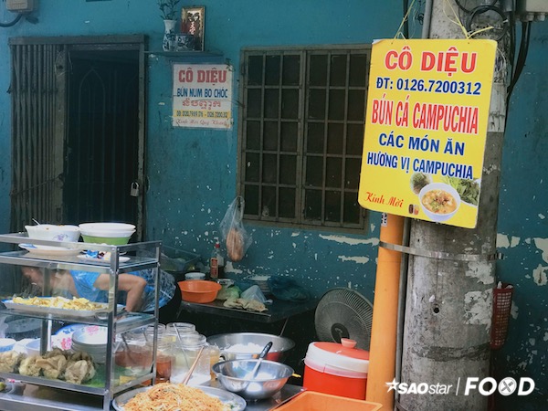 Quán Cô Diệu là một trong những nơi phục vụ món này đúng chuẩn, quán đơn sơ với vài chiếc bàn bắt ở ven con hẻm nhỏ nhưng rất sạch sẽ, tinh tươm. Giá mỗi tô bún ở đây là 40.000 đồng, còn về đầu cá thì cô sẽ tính theo kích cỡ, tuỳ lớn bé mà dao động từ 50.000-70.000 đồng một phần đầu cá. Ngoài ra, quán còn có món hủ tiếu xào, bánh khọt tất cả đều nấu theo khẩu vị của người Campuchia.