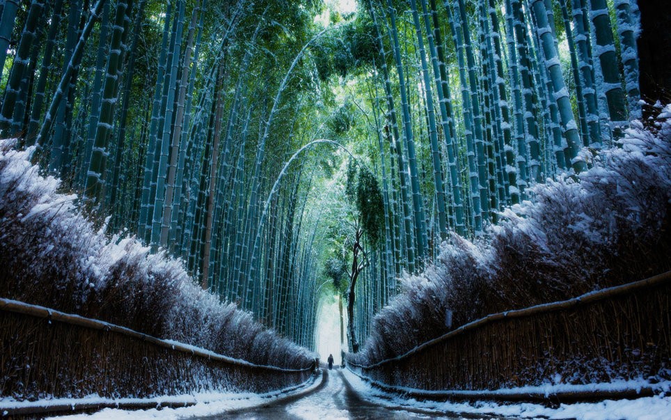 Công viên Arashiyama (Nhật Bản): Arashiyama là công viên nổi tiếng ở Kyoto, Nhật Bản, với phong cảnh lãng mạn và những ngôi đền cổ kính. Mùa đông đến, tuyết phủ dọc lối đi trong rừng tre ở công viên này trông giống như lối đi đến thiên đường. Ảnh: Getty Images/Moment RF.