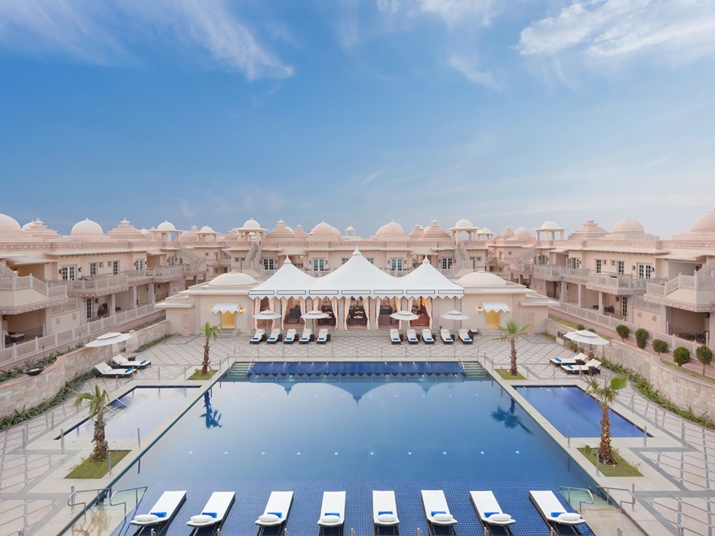 ITC Grand Bharat (Gurgaon, Ấn Độ): ITC Grand Bharat có kiến trúc như một cung điện tuyệt đẹp, với 104 phòng mang phong cách kiến trúc Ấn Độ cổ điển: mái vòm, đá sa thạch hồng được chạm khắc tinh tế, đầy đủ dịch vụ chăm sóc hiện đại như khu spa, các lớp học yoga.