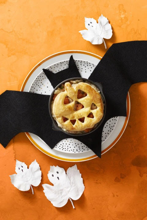 Dùng khuôn cắt bánh tạo hình 6 quả bí trên 2 miếng bột ngàn lớp (như ảnh) sau đó đặt miếng bột lên trên khuôn bánh. Quét một lớp trứng gà ở trên cùng.
