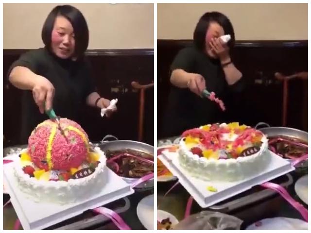 Chưa kịp ăn chiếc bánh hình tròn đã nổ tung khiến chủ nhân bữa tiệc sinh nhật phải giật mình