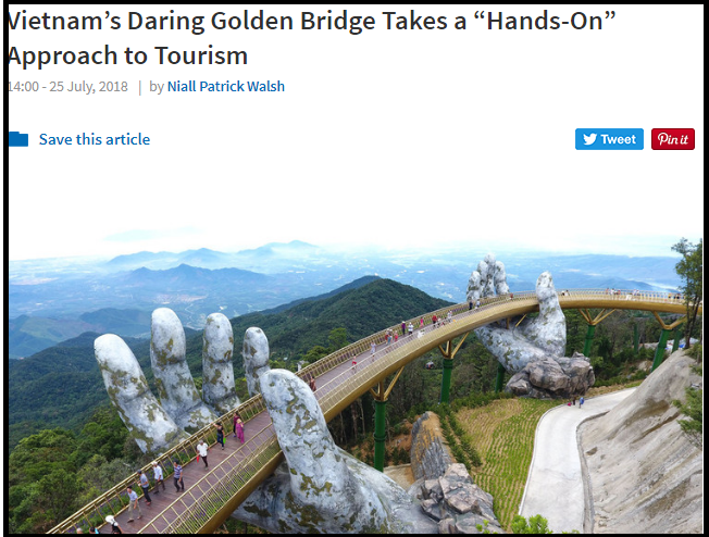 Archdaily viết: “Tọa lạc trên ngọn núi cao nhất Đà Nẵng là một cây cầu có thiết kế vô cùng độc đáo, ấn tượng. Nó uốn lượn gần 150 mét, được tô điểm bởi hoa lá khoe sắc xung quanh. Về hình dáng, nó tựa lưng vào núi Bà Nà và như đang được nâng đỡ bởi một đôi bàn tay khổng lồ”