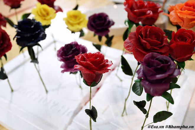 - Những cánh hoa sau khi được cán mỏng cắt định hình sẽ được cho vào khuôn để ép vân. Khi ép vân, ấn 2 đầu chặt, ấn ở giữa nhẹ một lần. Cứ như thế công việc này được làm thủ công nhưng sẽ cho ra những cánh hoa đặc sắc.