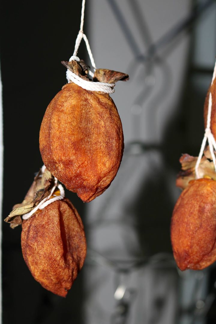 Quả hồng trứng sau khi treo 4 ngày. Nếu thấy dấu hiệu quả nào chớm mốc (sợi tơ trắng/xám lún phún trên bề mặt), hãy cho đồng loạt hồng còn lại rửa qua cồn và lấy giấy thấm khô rồi tiếp tục phơi thì có thể “cứu” được. Lý do dùng cồn mà không dùng rượu lúc này vì quả hồng những ngày sau đã hết ướt bề mặt, dùng cồn rửa nhanh bay hơn thì nó không bị ướt lại. Khoảng ngày thứ 5-7, tùy điều kiện thời tiết và quả hồng nhỏ hay to, bề mặt quả đã khô như một lớp da dai nhẹ bọc bên ngoài, bên trong mềm ra và xuống mật, thì đến một công đoạn rất hay ho đòi hỏi sự khéo léo nhẹ nhàng và cả nội công kiềm chế ham muốn… xơi luôn.