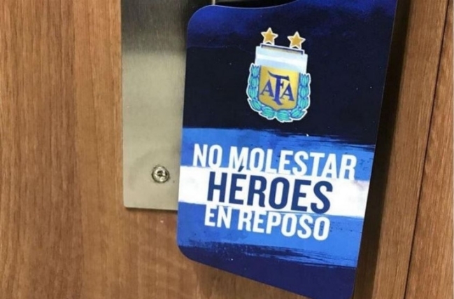 Được biết, tiền đạo Lionel Messi ở chung phòng với tiền đạo Sergio Aguero. Trước phòng của họ có treo một tấm bảng gi bằng tiếng Tây Ban Nha, dịch ra là ”Đừng làm phiền. Các anh hùng của chúng ta phải nghỉ ngơi”