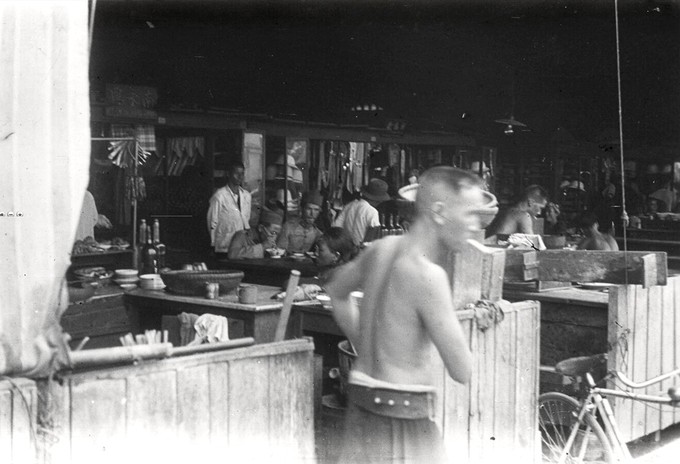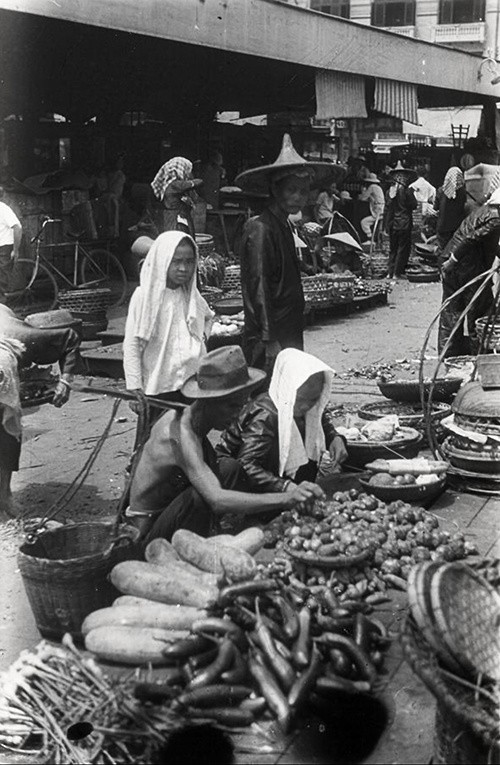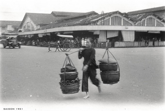 Một người phụ nữ gánh hàng ở phía sau lưng chợ.