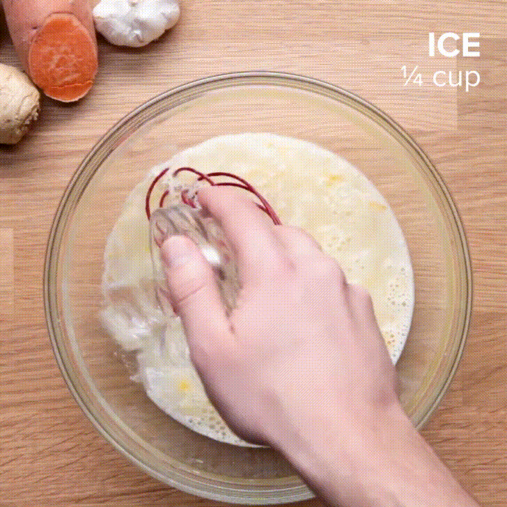 Sau đó, cho 1 bát đá viên nhỏ vào chung với hỗn hợp soda trứng. Việc cho đá lạnh vào hỗn hợp trên sẽ giữ bột được lạnh và ngăn bột hình thành gluten. Đây là bí quyết giúp bột vẫn được giòn và nhẹ sau khi chiên.