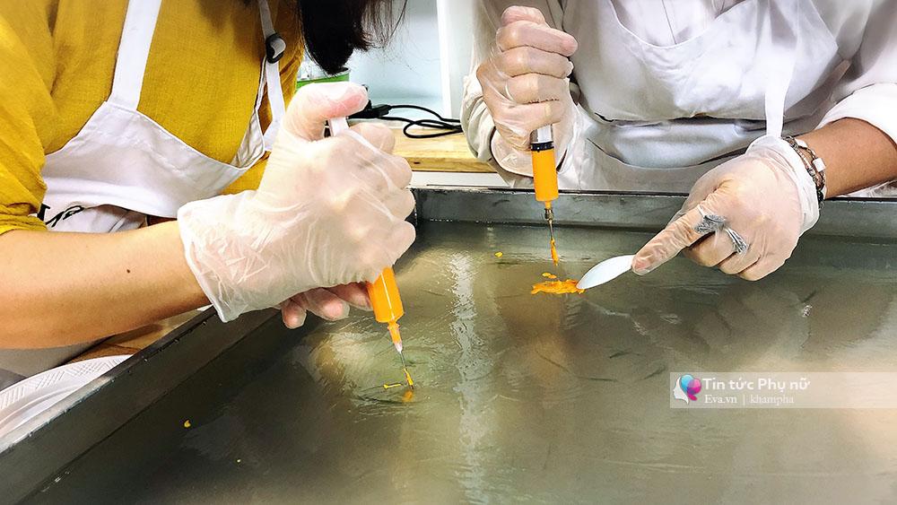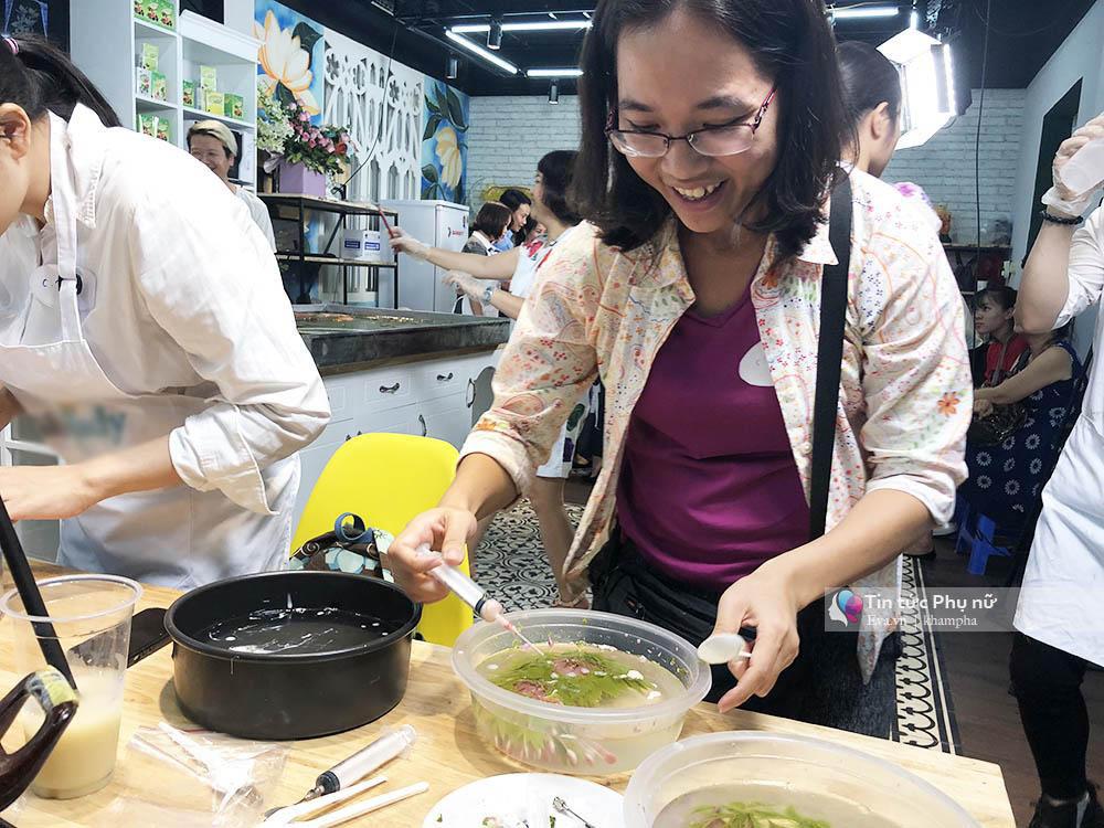 Bạn Thủy, 23 tuổi, cho biết: “Mình đến đây từ sớm để quan sát các nghệ nhân và các chị em khác làm thạch. Còn giờ thì muốn tự tay làm một chiếc bánh thạch cho riêng mình xem thế nào!”