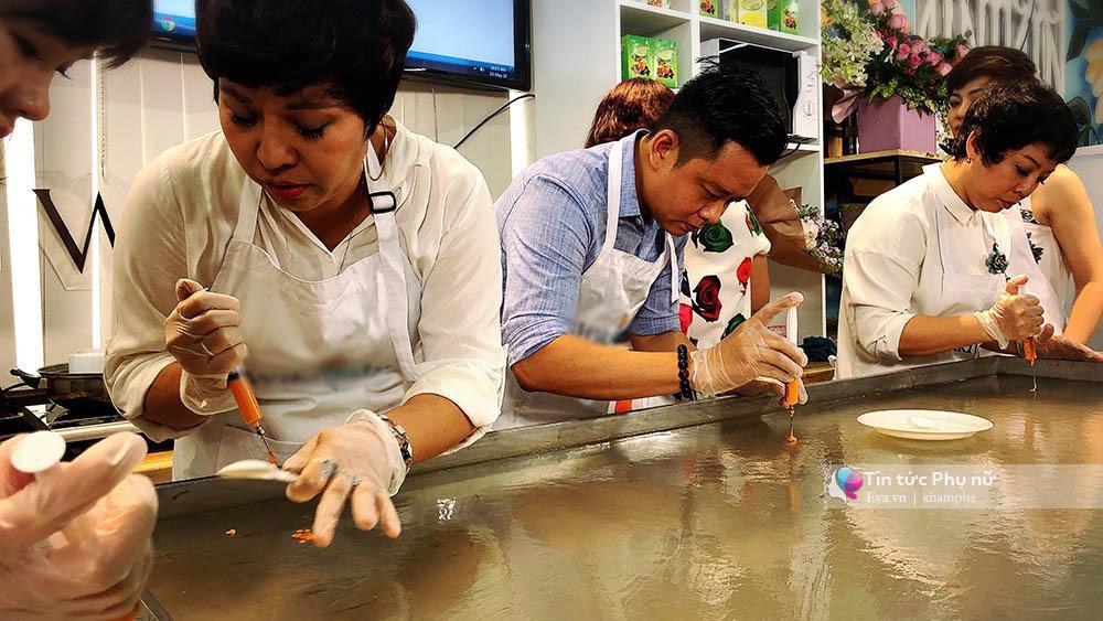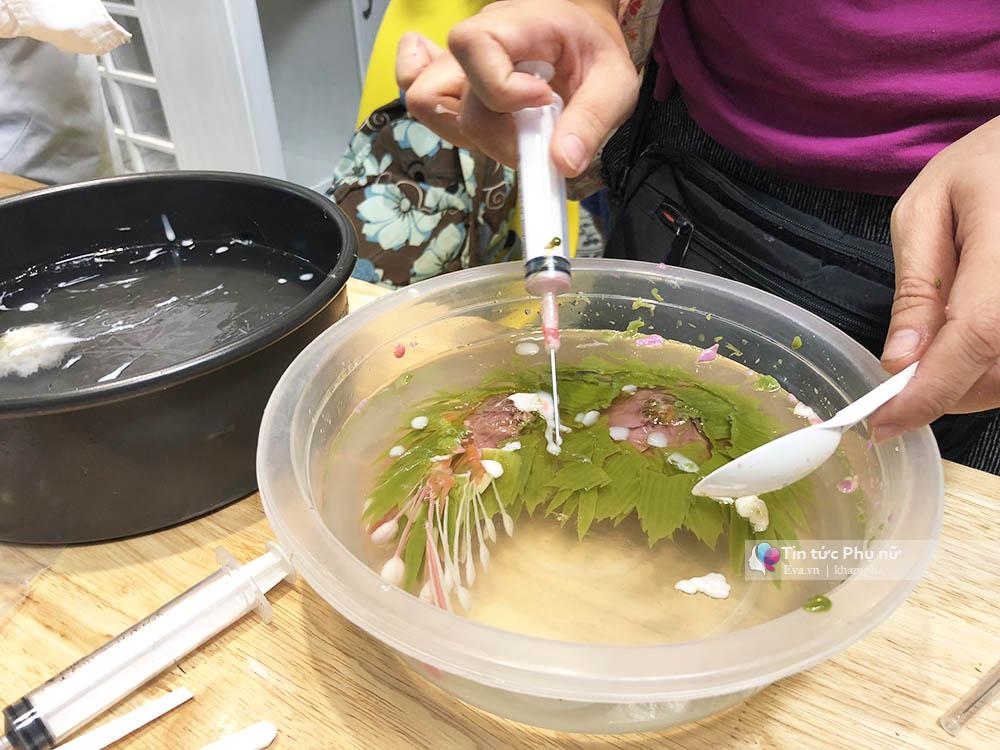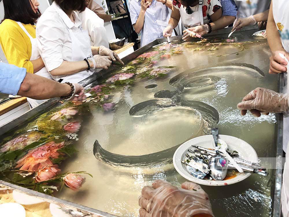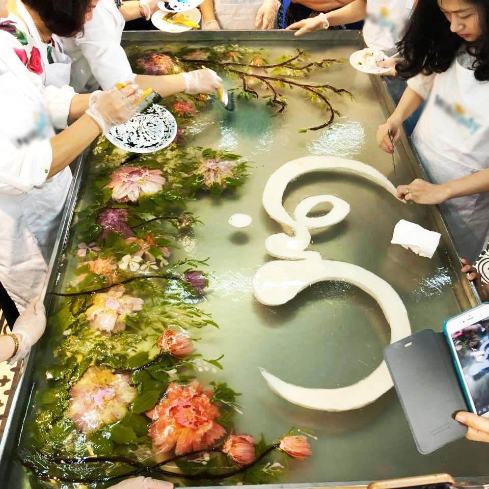Giảng viên Kiều Vân chia sẻ: “Chúng tôi đã chuẩn bị lớp base thạch này từ ngày hôm qua bởi nó tốn 5 tiếng đồng hồ để đông lại hoàn toàn. Cần đến 15 nồi thạch được đun cùng lúc để tạo ra một khối thạch đồng nhất.”