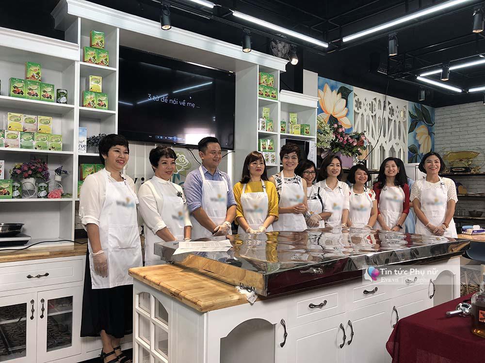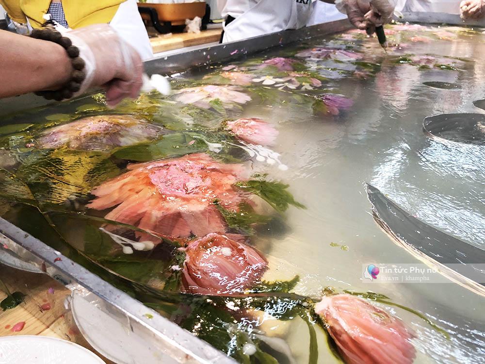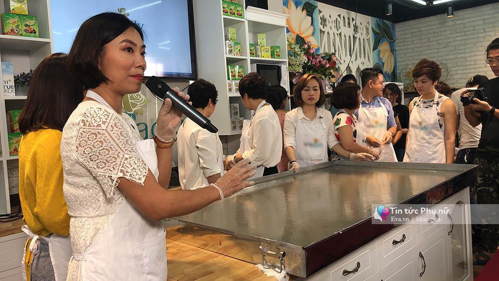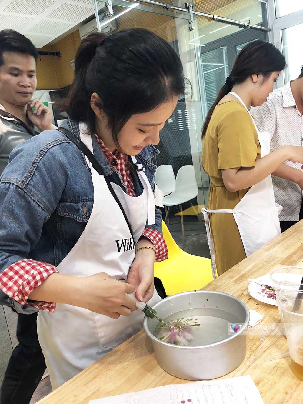 Giảng viên Kiều Vân chia sẻ: “Chúng tôi đã chuẩn bị lớp base thạch này từ ngày hôm qua bởi nó tốn 5 tiếng đồng hồ để đông lại hoàn toàn. Cần đến 15 nồi thạch được đun cùng lúc để tạo ra một khối thạch đồng nhất.”