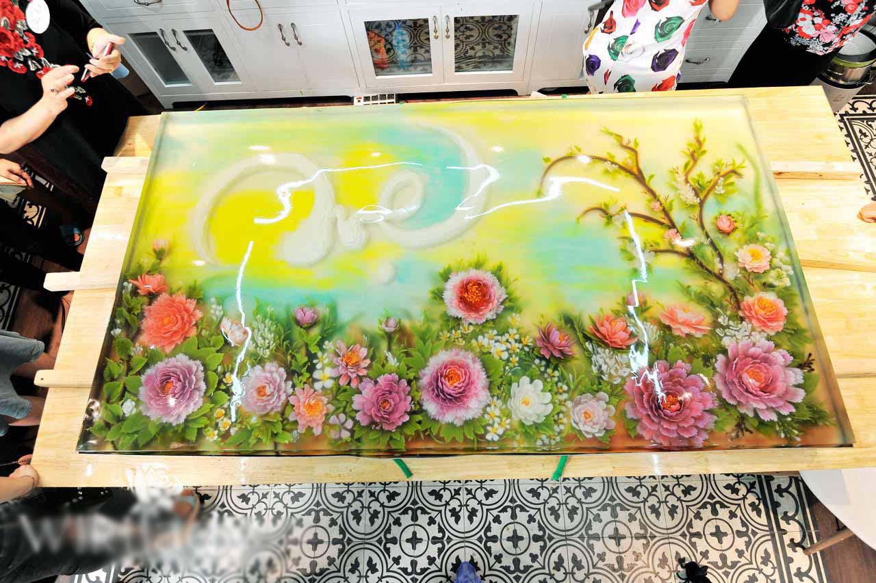 Sau 4 tiếng, giây phút lật bánh khiến mọi người vỡ òa cảm xúc khi lần đầu tiên chiếc bánh thạch cỡ khủng với kích thước 1m x 1,8m, cao 10cm, nặng hơn 200kg hiện ra. Trong nền thạch trong suốt như pha lê là bức tranh đẹp hài hòa với những bông hoa mẫu đơn sắc nét, những chi tiết cỏ cây đẹp long lanh và nổi bật trên bức tranh ấy là chữ MẸ đầy trân quý. Sự tích hoa mẫu đơn gắn liền với nước mắt của người mẹ.
