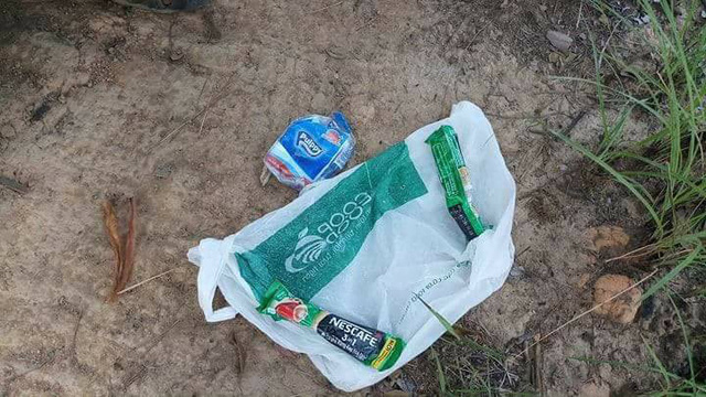 Bịch túi bóng chứa đồ dùng cá nhân được cho là của K. được nhóm tìm kiếm phát hiện trong rừng sâu gần khu vực thác Lao Phào.