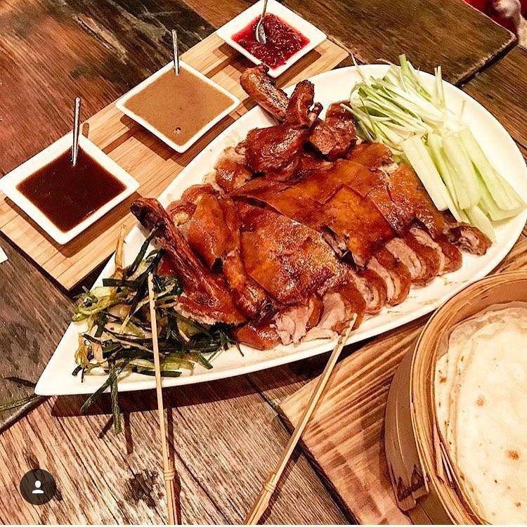 Vịt được quay trong lò, với điểm nhấn là lớp da căng giòn, ăn kèm với bánh bao. Một món vịt ngon không thể không kể đến nước sốt vừng đậu phộng giúp thịt đậm đà tròn vị hơn.