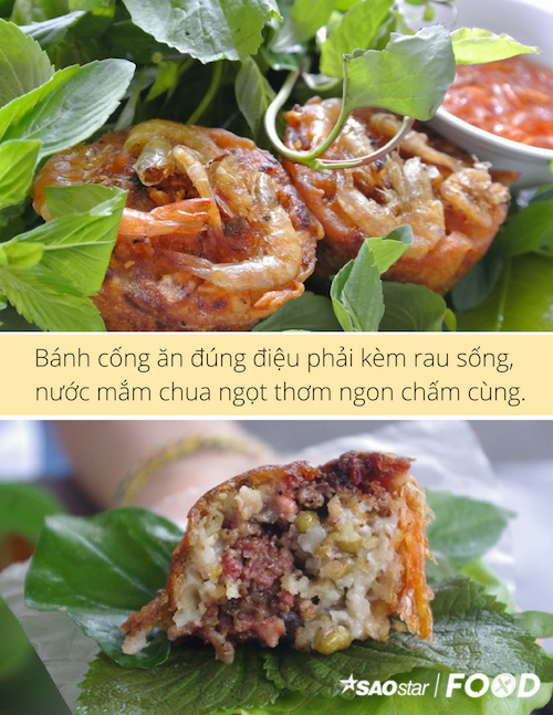 Bánh cống ăn đúng điệu phải kèm thêm rau sống, chén nước mắm chua ngọt thơm ngon chấm cùng. Món đồ chiên có vài lát rau sẽ tiếp thêm tươi mát và thơm ngon cho món ăn đỡ ngấy. Gói gém bánh trong lớp rau xanh, chấm thêm chút mặn chút chua ngọt từ nước mắm tỏi ớt. Hương vị dân dã và đồng quê lan toả khắp khuôn miệng. Chỉ là món bánh ăn chơi mộc mạc nhưng không kém phần bắt vị và đậm đà nét ẩm thực của người miền Nam.