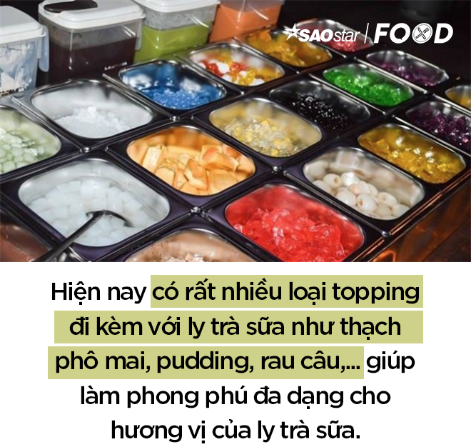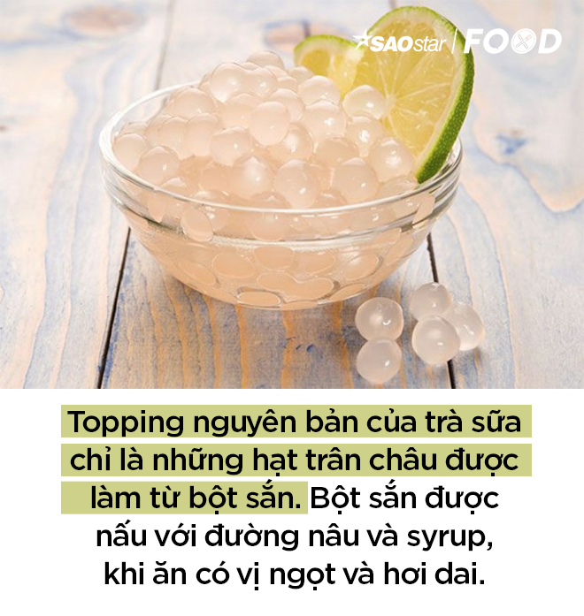 Topping nguyên bản của trà sữa chỉ là những hạt trân châu được làm từ bột sắn. Bột sắn được nấu với đường nâu và syrup, khi ăn có vị ngọt và hơi dai. Tuy nhiên, ngày nay cùng với thị hiếu cũng như sự sáng tạo mà hiện tại “gia đình” topping của trà sữa đã vô vàn thể loại, nào là pudding, thạch thuỷ tinh, milkfoam, … Tạo nên sự phối hợp ăn ý cùng với vị ngọt của thức uống.