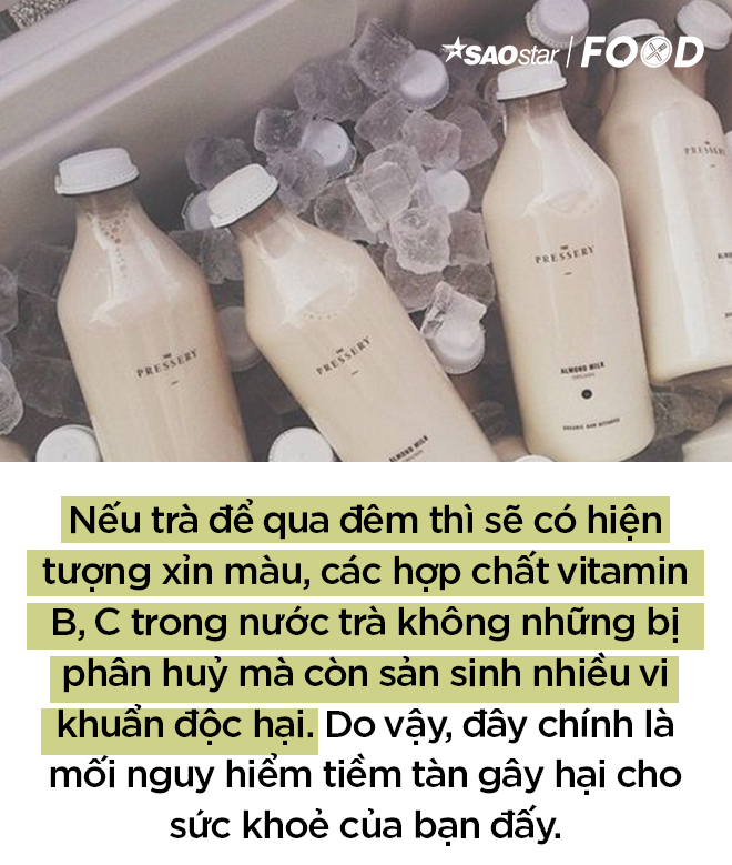Bạn nghĩ rằng vì là một thức uống pha chế như trà sữa có thể qua đêm ư? Rất tiếc câu trả lời là “Vứt nó đi nhé!”. Trong thành phần của trà sữa đương nhiên phải có trà rồi đúng không? Vì thế, nếu trà để qua đêm thì sẽ có hiện tượng xỉn màu, các hợp chất vitamin B, C trong nước trà không những bị phân huỷ mà còn sản sinh nhiều vi khuẩn độc hại. Do vậy, đây chính là mối nguy hiểm tiềm tàn gây hại cho sức khoẻ của bạn đấy. Cho nên, dù cho có phát nghiện trà sữa đến nỗi phải mua về trữ trong tủ lạnh thì bạn cũng từ bỏ thói quen ấy đi nhé. Chẳng những hương vị của thức uống bị giảm đáng kể mà còn ẩn chứa nhiều nguy hiểm tiềm tàn ảnh hưởng không tốt đến sức khoẻ nữa đấy.