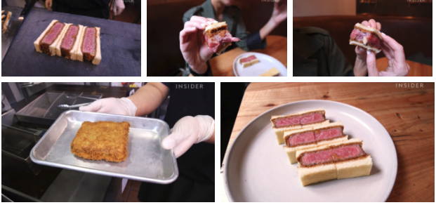 Ngoài ra, đầu bếp sẽ phết bơ lên bánh mì và nước sốt katsu lên lát thịt bò. Sau đó, chỉ cần úp một lát bánh mì như thế lên thịt bò là đã hoàn thành xong món sandwich đắt đỏ trên. Trước khi đưa đến bàn cho thực khách thưởng thức, miếng sandwich này sẽ được cắt thành 6 miếng nhỏ để tiện ăn hơn. Thực khách thưởng thức chắc chắn sẽ vô cùng thích thú khi cảm giác được phần thịt bên trong vẫn chỉ vừa được tái chín nên màu sắc, độ ngọt và độ mềm của thịt sẽ vẫn còn được giữ nguyên vẹn hoàn hảo dù đã được chiên vàng.