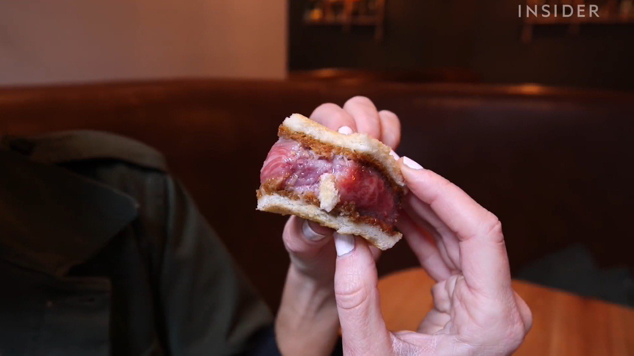 Được biết, món sandwich này có tên là Wagyu Katsu Sando với xuất xứ từ Nhật Bản. Thành phần chính của món sandwich đắt đỏ này chính là thịt bò thượng hạng ở Nhật có tên là Wagyu. Để mua được nguồn nguyên liệu thượng hạng này, người ta phải bỏ 100 USD (2,3 triệu đồng) cho cho 450gr thịt bò. Chính vì thế, món sandwich này có giá vô cùng đắt đỏ.