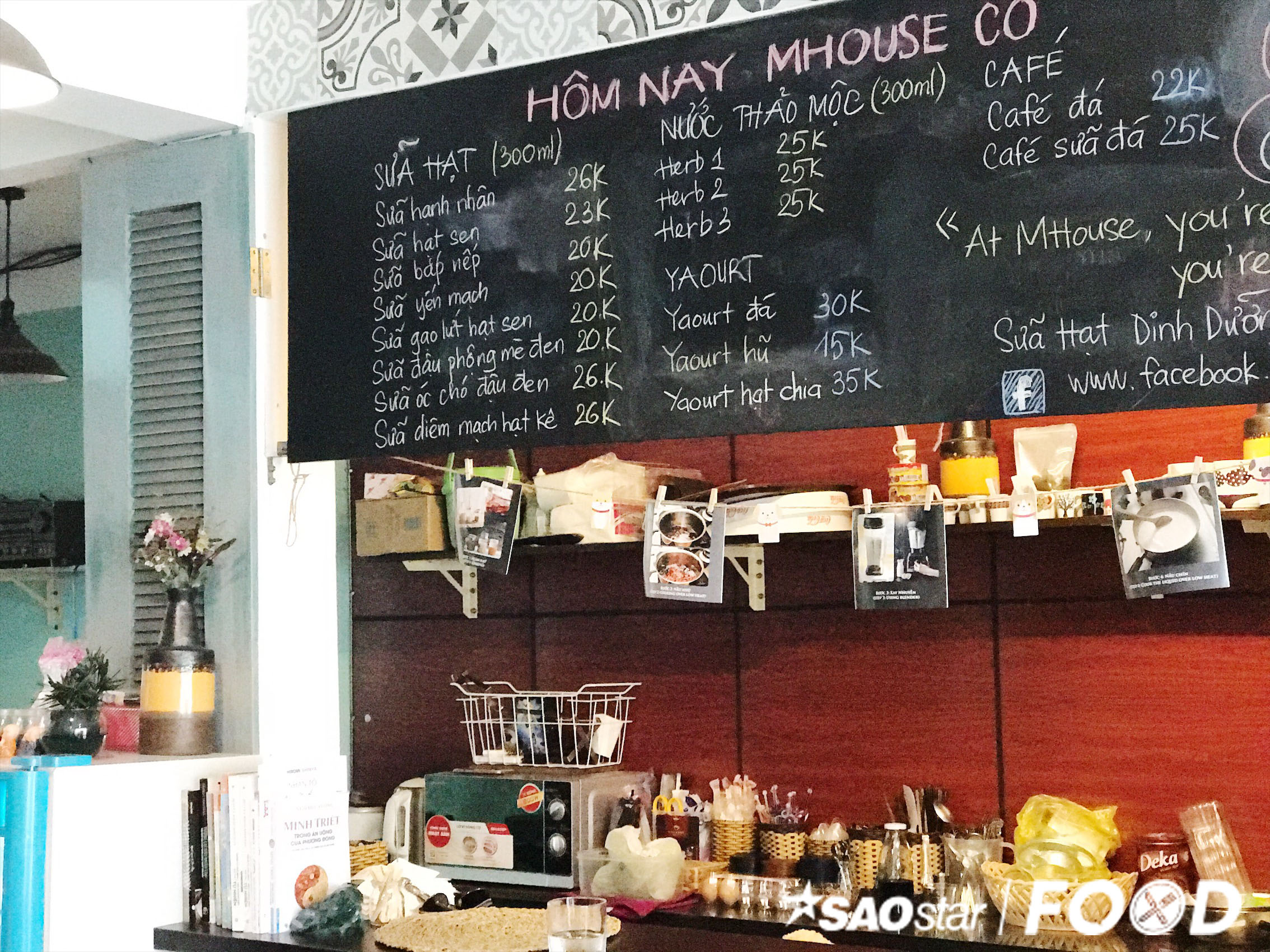 Thức uống đặc sắc nhất ở M House là sữa hạt. Có gần hai mươi loại sữa hạt cho mọi người chọn lựa, chủ yếu từ: đậu đen, gạo lứt, hạt óc chó, hạnh nhân, đậu phộng, hạt kê,… Ngoài ra ở M House còn có các loại nước uống thảo mộc được lấy từ trang trại organic Đà Lạt như hoa oải hương, gừng,….