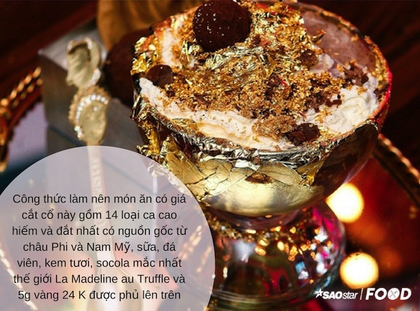 Để hoàn thành món kem tuyệt tác trị giá đến 25.000USD này, các đầu bếp 5 sao đã phải chọn lọc ra 28 viên cacao thuộc vào hàng đắt nhất thế giới. Quanh cốc kem có một chiếc vòng vàng 18k gắn viên kim cương 1carat. Sau khi thưởng thức bữa ăn đẳng cấp hoàng gia khách sẽ được tặng một chiếc muỗng nạm kim cương trị giá tận 14.000 USD (khoảng 318 triệu đồng).