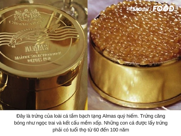Trứng cá muối Almas là một mặt hàng cực kì quý hiếm từ Iran. Trứng cá muối đã là một món đắt đỏ, trứng cá muối Almas lại càng đắt hơn bởi độ khan hiếm của nó. Chỉ có một cửa hàng hiện nay bán loại thực phẩm này là Caviar House & Prunier ở Picadilly, London. Mỗi kilogam trứng cá muối được đặt trong một hộp làm bằng vàng 24 karat với giá bán là 25.000USD, khoảng 556 triệu đồng.